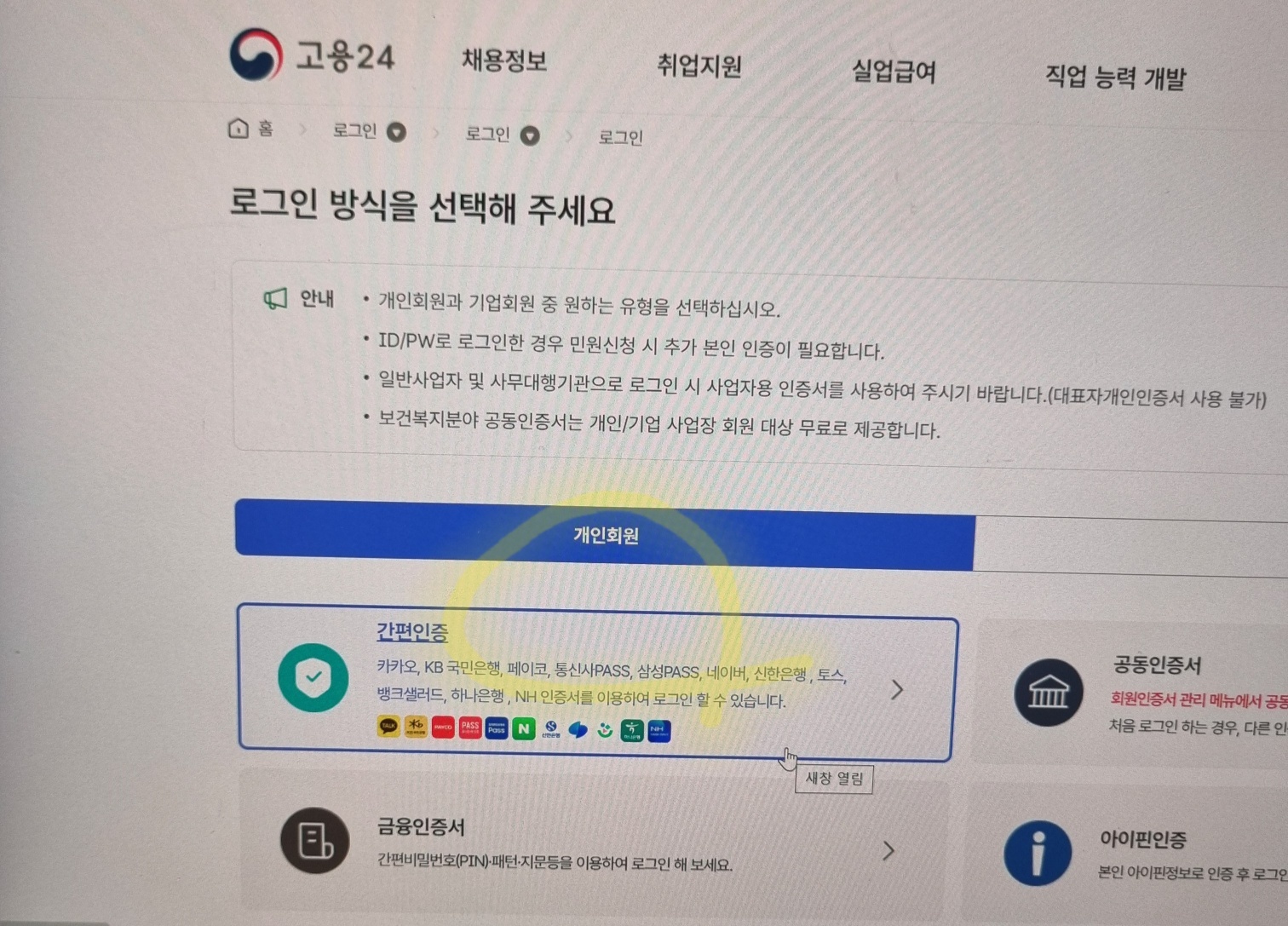 <개인>으로 <로그인>을 하고, 간편 인증을 한다.